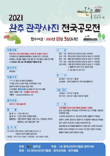 접수는 11월 3일까지 한국사진작가협회 완주지부(wanjuphoto@daum.net)를 통해 가능하며 자세한 공모전 내용은 완주군청 홈페이지와 한국사진작가협회 홈페이지를 통해 확인할 수 있다.