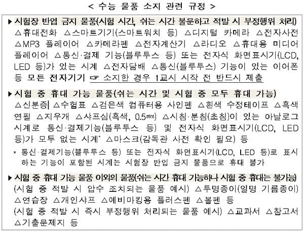 전자기기의 경우, 시험장 반입 금지 물품으로 시험장에 반입한 경우 1교시 시작 전 제출해야 한다. 참고서와 교과서 등은 쉬는 시간 휴대가 가능하나 시험 중에는 휴대를 금지한다.