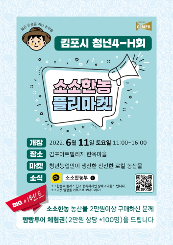 '소소한농 플리마켓'은 김포시의 청년농업인으로 구성된 김포시4-H회 회원들이 생산한 신선한 농산물과 가공품을 판매하는 장터로 직접 생산한 버섯, 흑미 등 고품질 농산물과 청년이 그린 피자와 김포 유과 등 정성껏 만든 다양한 농가공품들이 판매될 예정이다. 또한 다육식물 심기와 테라리움 등 다양한 체험도 진행된다.