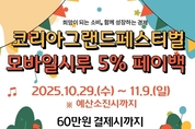 【국제일보】 고양특례시(시장 이동환)는 오는 29일부터 11월 9일까지 12일간 진행되는 코리아 그랜드 페스티벌을 맞아 고양페이 결제금액의 5%를 환급(캐시백)하는 특별할인 행사를 한다고 밝혔다. 시는 행사 기간에 지역화폐인 고양페이를 사용하는 소비자에게 기존 할인율 10%에 더해 결제금액의 5%를 캐시백으로 지급한다. 1인당 최대 1만원까지 지급되며, 예산 소진 시 행사는 조기 종료된다. 다만, 민생회복 소비쿠폰 등 정책 수당 등은 결제금액에 적용되지 않으며, 결제금액 중 사용자 충전금에 한해서 적용된다. '코리아 그랜드 페스티벌'은 '희망이 되는 소비, 함께 성장하는 결제'를 슬로건으로 한 대한민국 최대 규모의 국가통합 소비 활성화 프로젝트이다. 시는 이번 행사가 가계 부담을 줄이고 지역 소상공인의 매출 증대에 기여할 것으로 보고 있다. 고양시 관계자는 "이번 추가 인센티브 지급은 지역 소비 확대를 통해 지역경제를 활성화하는데 도움이 될 것"이라고 전했다.
