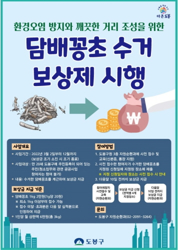 서울도봉구(구청장 이동진)가 오는 3월부터 담배꽁초 수거보상제를 시행한다고 22일 밝혔다.