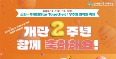 【국제일보】 서울 강서구(구청장 진교훈)가 강서별빛우주과학관(관장 심재현) 개관 2주년을 맞아 '스타 투게더(Star Together): 우주와 과학의 축제'를 개최한다고 밝혔다. 이번 행사는 천체영상전, 과학마술쇼, 전문가특강, 체험활동 등 다채로운 프로그램으로 구성됐다. 천체영상전은 11월 1일부터 2일까지 ▲냥박사의 왜냐용(알쏭달쏭 별자리) ▲길냥이키츠(국제우주정거장의 비밀) ▲길냥이키츠(슈퍼문 대모험) ▲ ▲오로라 Lights of Wonder 영상을 볼 수 있다. 천체영상실에서 무료로 관람할 수 있다. 같은 기간 과학관 앞마당에서는 과학마술쇼가 진행된다. 매직사이언스, 과학술사, 과학퍼포먼스를 관람할 수 있다. 우천 시 사전예약자 한정, 과학관 실내에서 진행될 예정이다. 전문가특강도 마련됐다. ▲곽재식 숭실사이버대 교수의 '한국의 전설과 우주'(11월 1일) ▲권오철 천체사진작가의 '신의 영혼 오로라'(11월 2일) 및 '밤하늘 촬영기'(11월 9일) ▲이태형 충주고구려천문과학관 관장의 '누리호 발사를 앞두고'(11월 8일) 등으로 구성됐으며, 2주간 진행된다. 특강은 사전 예약이 필요하며, 회차별 65명 선착순 모집으로 초등학생 이상이면 수강할 수