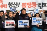 (서울=연합뉴스) 전국민주노동조합총연맹(민주노총)은 7일 노란봉투법(노동조합 및 노동관계 조정법 2·3조 개정안) 시행을 앞두고 고용노동부가 마련한 시행령 개정안을 폐기할 것을 요구했다. 민주노총은 7일 오전 서울 종로구 청와대 앞에서 신년 기자회견을 열어 "올해를 원청교섭의 원년으로 삼겠다"며 "진짜 사장이 책임지는 원청교섭 구조를 반드시 쟁취하겠다"고 밝혔다. 민주노총은 노동부가 입법예고한 노동조합법 시행령 일부 개정안을 폐기해야 한다고 주장했다. 현행 노동조합법에는 교섭 창구 단일화 절차가 규정돼 있는데 노동부는 이번 시행령 개정안을 통해 교섭 창구의 분리·통합과 관련된 결정 기준과 절차를 구체화했다. 민주노총은 별도의 의견서에서 "(입법예고된) 시행령은 이중의 교섭 창구 단일화 절차를 설정해 교섭 성사에 이르는 과정에서 행정적, 법적 다툼을 예고하고 있다"며 "복잡한 교섭구조와 절차를 설계한 것은 원청사용자의 교섭비용을 줄여주겠다는 의도"라고 비판했다. 민주노총은 산하 1천365개 사업장의 노조 대표자들이 서명한 이 의견서를 청와대에 전달했다. 양경수 민주노총 위원장은 "(노동자들의) 투쟁의 결과물로 이제 하청 노동자들이 원청과 교섭할 수 있는 근거를