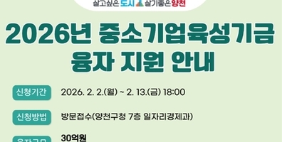 【국제일보】 양천구(구청장 이기재)는 경기침체 장기화로 경영 부담이 가중되고 있는 중소기업과 소상공인의 자금난 완화를 위해 2026년 상반기 30억 원 규모의 '중소기업 육성기금' 융자 지원에 나선다고 3일 밝혔다. 이번 상반기 중소기업 육성기금 지원 규모는 총 30억 원으로, 제조업은 최대 3억 원, 도·소매업과 기타 업종은 최대 8천만 원까지 융자를 받을 수 있다. 상환 조건은 2년 거치 3년 균등분할 상환이며, 특히 대출 금리를 연 0.8%로 동결해 서울시 자치구 중 최저 수준의 금리를 유지함으로써 중소기업과 소상공인의 재정부담을 최소화했다. 지원 대상은 양천구에 사업장을 두고 공고일(2월 2일) 기준 사업자등록 후 6개월이 경과된 중소기업과 소상공인이다. 단, 무점포 소매업, 담배 도·소매업, 음식점업, 부동산업, 금융업 등 일부 업종과 공고일 기준 기존 수혜업체(상환 중이거나 상환 후 1년 미경과)는 신청 대상에서 제외된다. 지원을 희망하는 업체는 이달 13일까지 ▲융자신청서 ▲사업계획서 ▲사업자등록증 ▲국세·지방세 납입 증명서 ▲매출액 증빙서류 등을 구비해 양천구청 일자리경제과에 방문 제출하면 된다. 이후 기금운용위원회 심의를 거쳐 최종 선정된 업