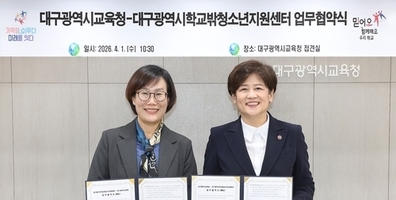 【국제일보】 대구시교육청은 1일 시교육청 접견실에서 대구학교밖청소년지원센터(센터장 최미송)와 '학교 밖 청소년 지원을 위한 업무협약'을 체결했다고 밝혔다. 이번 업무협약은 학교 밖 청소년이 건강한 사회의 구성원으로 성장할 수 있도록 양 기관 간의 긴밀한 연계와 협력 체계를 강화하기 위해 마련됐다. 양 기관은 이번 협약을 통해 ▲학교 밖 청소년 발생 시 조기 연계와 후속 조치를 위한 정보 공유 ▲학교 밖 청소년의 학업 복귀를 위한 교육지원에 관한 사항 ▲양 기관의 실무협의회 정례화(연 1회 이상) 등을 골자로 상호 협력하기로 약속했다. 특히, 학교를 떠나는 청소년들이 적기에 지원을 받을 수 있도록 정보 공유 체계를 공고히 하고, 이들이 다시 학업을 이어갈 수 있도록 맞춤형 교육지원을 확대하는 데 집중할 계획이다. 이번 협약은 체결일로부터 효력이 발생하며, 별도의 해지 통보가 없는 한 1년씩 자동 연장되어 지속적인 협력이 추진될 예정이다. 이날 협약식에는 대구시교육청 강은희 교육감, 백채경 교육국장, 이해연 생활인성교육과장과 대구학교밖청소년지원센터 최미송 센터장, 김도한 팀장 등 주요 관계자들이 참석해 학교 밖 청소년들을 위한 실질적인 지원 방안에 대해 환담을