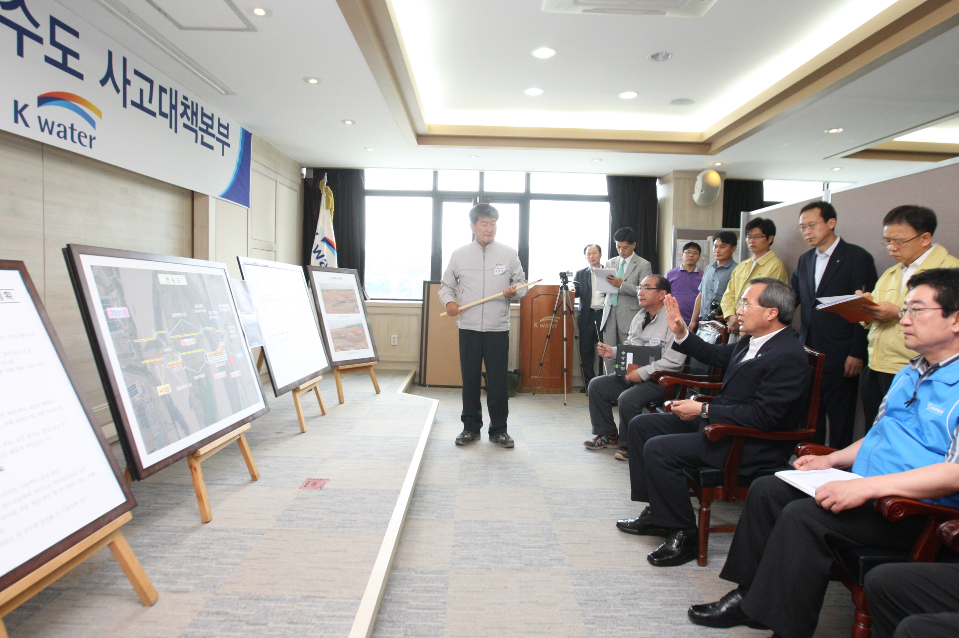 국민권익위원회 김대식 부위원장은 8일 오전 지난달 30일 단수사고가 발생한 구미시 한국수자원공사 구미관리단(구미정수장)을 방문해 관계자로부터 사고 현황 설명을 듣고 있다.(아래)