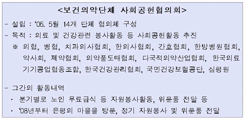 전재희 보건복지가족부장관과 보건의약계 13개 단체장이 참여한 '보건의약단체 사회공헌협의회'는 9월 30일 오후 2시 사회공헌활동 추진 협약서를 체결하고 서울시 시립 은평의 마을을 방문해 사회공헌활동을 펼친다.사회공헌협의회는 사회공헌협약서를 체결하여 소외된 이웃들의 건강한 생활을 보장하며, 나눔의 참뜻을 가꾸어 나가는 동반자가 되어 따뜻한 사회를 만들기 위해 함께 할 것을 협약한다.