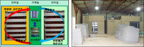 이 건조기는 히트펌프와 제어기를 설치한 기계실과 좌·우에 배치된 2개의 건조실(3×5×3.2m, 폭×깊이×높이)로 구성되어 있다.