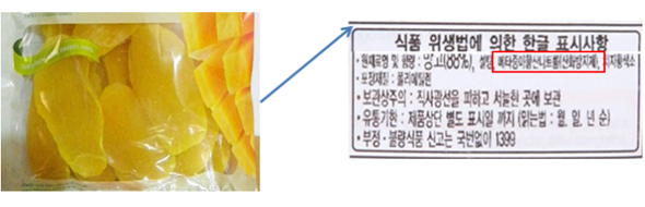 표백제 또는 산화방지제로 아황산염을 사용한 가공식품의 포장지에는 원재료명 및 함량에 아황산염의 명칭과 그 용도인 표백제 또는 산화방지제를 함께 표시하도록 하고 있어[예: 메타중아황산나트륨(산화방지제)] 소비자들이 보고 선택할 수 있다.