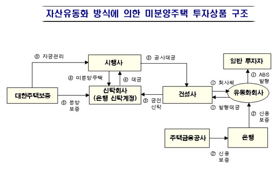 자산유동화 방식은 주택 건설사가 일반 투자자를 대상으로 유동화 채권을 발행해 자금을 조달하고 조달된 자금을 신탁회사에 위탁해 신탁회사가 미분양주택을 취득, 분양하도록 하는 방식이다.