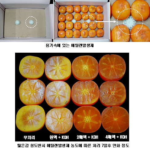 떫은 감은 수확 후 인위적으로 홍시(연시)를 제조하지 않고 자연 상태로 두면 연시가 잘 되질 않는데, 이번에 개발한 에틸렌 발생제는 인위적인 방법 중에서 가장 안전한 방법이다.