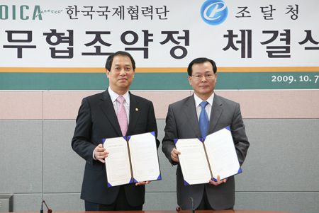 조달청과 한국국제협력단(KOICA) 업무협조약정 체결 권태균 조달청청장(좌측)은 10월7일 박대원 한국국제협력단 이사장(우측)과 무상기술협력사업의 효과적인 수행을 위해 상호 협력하기로 하는 업무협조약정을 체결했다.