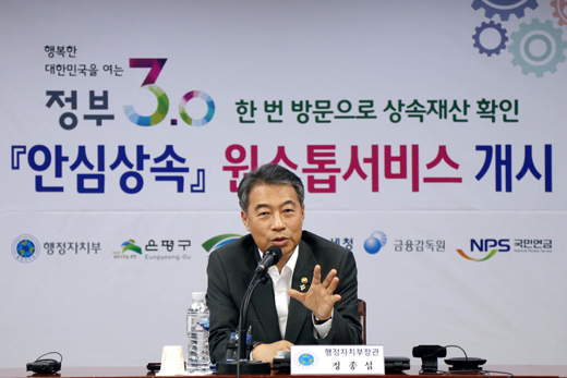 사망신고를 하면서 상속재산 조회신청까지 한꺼번에 할 수 있는 ‘안심 상속 원스톱 서비스’가 지난달 30일부터 전국적으로 시행되고 있다. 이는 국민이 신청하기 전에 정부가 먼저 필요한 정보를 패키지로 제공하는 올해 정부3.0 핵심과제인 ‘생애주기 서비스’의 첫 시작이기도 하다. 이제 막 첫 발을 내딛은 ‘안심 상속 원스톱 서비스’에 대해 정종섭 행정자치부 장관이 직접 설명했다.(편집자 주)