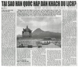 신문은 “1962년부터 한국 정부는 ‘연기 없는 공업’에 집중해 한국 문화 홍보를 위한 인력 양성, 관광지 제작, 홍보 등 여러 분야에 걸쳐 노력을 해왔다”며 “한국이 문화 홍보를 위해 창조적이고 구체적인 전략을 수립했다”고 평가했다. 또한 “한국인들은 유명한 곳이 여행지로 활용될 수 있도록 잘 만들어 놓았다”며 독특한 관광지로 청계천과 쁘띠 프랑스 등을 꼽았다. <새하노이>는 “이러한 관광지들이 깨끗하고 편리해 관광객들에게 좋은 느낌을 줄 수 있다”고 전했다.