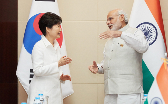 회담에서 박 대통령은 한·인도 관계가 “지난해 5월 모디 총리의 국빈 방한 계기 ‘특별 전략적 동반자관계’로 격상된 이후 새로운 단계에 진입했다”면서 “양국이 민주주의와 시장경제를 공유하고 상호 보완적인 경제 구조를 갖고 있는 만큼, 앞으로도 ‘특별 전략적 동반자관계’에 걸맞는 관계 발전을 이뤄 나가기 위해 함께 노력하자”고 말했다.