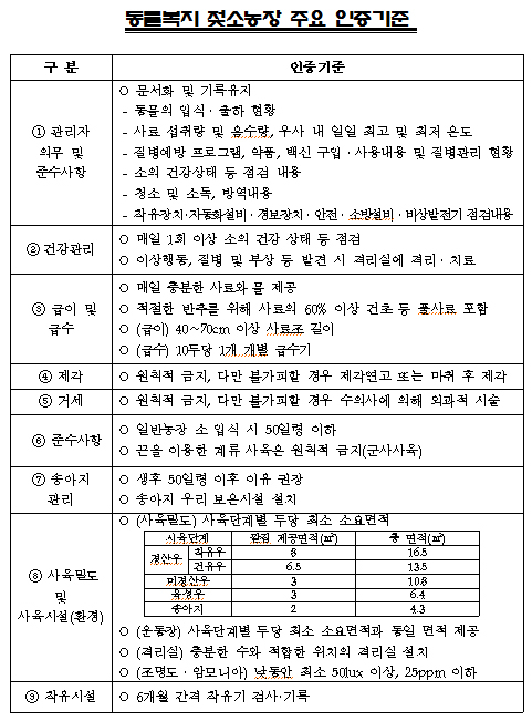 또한 “2012년 산란계를 시작으로 돼지·육계·한우·젖소·염소에 이어 올해 말에는 동물복지 오리농장 인증기준도 마련할 계획”이라고 밝혔다.