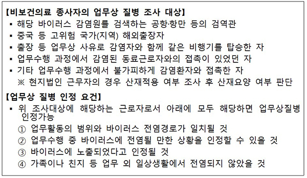 대상은 보건의료 및 집단수용시설 종사자와 비보건의료 종사자로, 업무수행 중 감염시 업무상질병판정위원회의 심의를 거쳐 업무상질병 및 업무상 재해로 인정한다.
