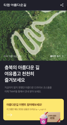 두 번째는 티맵을 이용해 '충북 아름다운 길'의 경로 안내로 주행만 해도 자동 응모된다.
