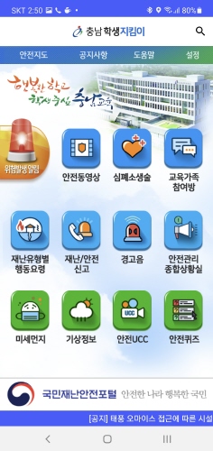 충남교육청(교육감 김지철)은 교육공동체에 다양하고 실질적인 안전 정보를 제공하기 위해 재난/안전관리 '충남학생지킴이' 앱(App)의 기능을 보완·개선했다고 27일 밝혔다.