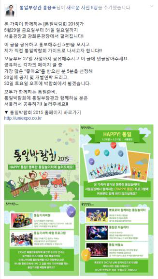 홍 장관은 페이스북 페이지에서 “온 가족이 함께하는 ‘통일박람회 2015’가 29일 금요일부터 31일 일요일까지 서울광장과 광화문광장에서 펼쳐집니다”라며 “이 글을 공유하고 홍보해주신 5분을 모시고 제가 직접 통일박람회 가이드로 나서고자 합니다”라고 밝혔다.