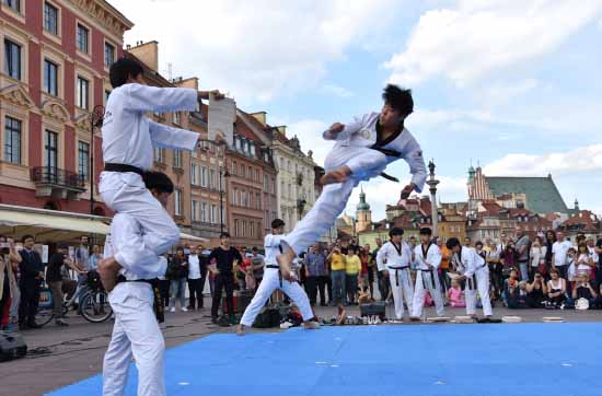 세계태권도평화봉사재단 소속 시범단이 19일 중부 유럽의 심장인 폴란드 바르샤바의 구시가지(올드타운) 잠코비 광장에서 태권도 게릴라 시범을 펼쳤다.