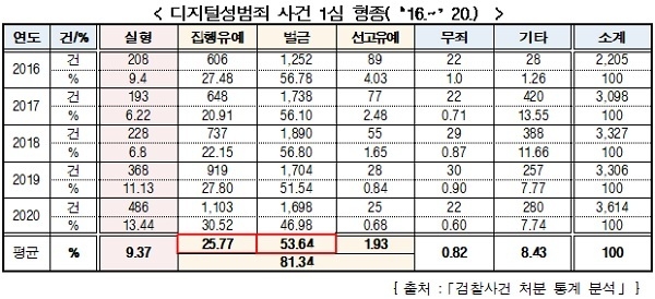 ‘검찰사건 처분 통계 분석’에 따르면 지난 2016년부터 2020년까지 디지털성범죄 사건의 1심 판결에서 실형이 선고된 경우는 평균 9.37%에 그쳤다. 81.34%는 집행유예나 벌금형, 선고유예를 선고받은 것으로 나타났다.