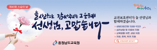 충청남교육청(교육감 권한대행 부교육감 전진석)은 제41회 스승의 날을 맞아 오는 27일까지 도내 모든 학교에서 '교육활동 보호 주간'을 운영한다고 밝혔다.