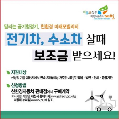 제천시 관계자는 "교통대기 환경개선을 통해 지속가능한 청정도시를 만들기 위해 친환경 자동차 보급이 더욱 확대될 수 있도록 전기자동차 민간보급사업에 시민분들의 적극적인 관심과 참여를 당부드린다"고 말했다.