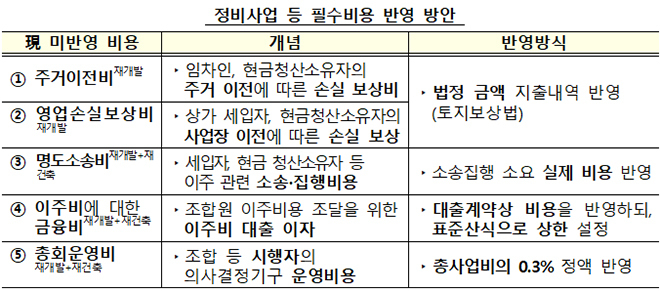 우선 국토부는 정비사업 추진 시 소요되는 필수 비용을 분양가에 반영하기로 했다.