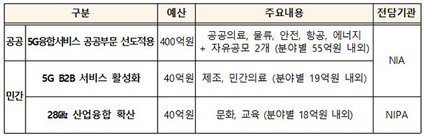 민간부분 4개 과제에는 80억을 투입해 5G 산업 생태계 전반의 활력 제고와 5G 28GHz 시장 선도를 위한 사업을 수행한다.