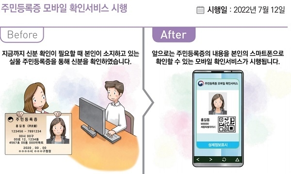 7월 12일부터 신분확인이 필요할 때 스마트폰으로 주민등록증의 내용을 확인할 수 있는 ‘주민등록증 모바일 확인서비스’ 시행된다. 성명, 주민등록번호, 주소, 사진, 발급일자, 주민등록 관할 지방자치단체를 확인할 수 있다.