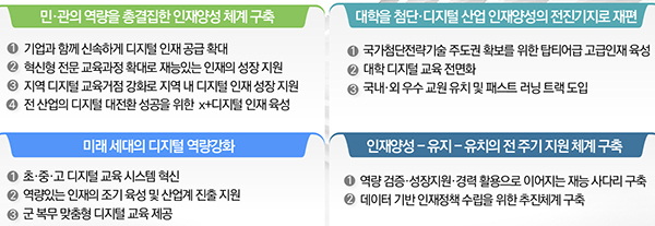 방안은 ▲민·관의 역량을 총결집한 인재양성 체계 구축 ▲대학을 첨단·디지털 산업 인재양성의 전진기지로 재편 ▲미래 세대의 디지털 역량 강화 ▲인재양성-유지-유치의 전 주기 지원 체계 구축 등을 담고 있다.