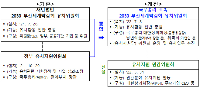 정부가 2030 부산세계박람회(엑스포) 유치 역량을 한데 모으기 위해 민간 재단법인이었던 유치위원회와 정부 유치지원위원회를 통합하기로 했다.