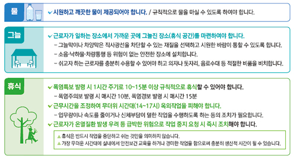 아울러 옥외 작업 시 사업주는 열사병 예방 3대 수칙인 물·그늘·휴식을 준수해야 하며, 고온의 실내 환경에서도 별도 예방조치를 해야 한다고 강조했다.