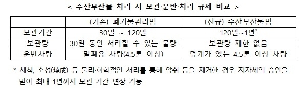 다만, 재활용 촉진을 위해 수산부산물 처리업자는 수산부산물을 최대 1년까지 보관할 수 있도록 했다. 주변 지역 환경오염 방지를 위해 악취나 침출수 등을 방지할 수 있는 보관 시설도 갖추도록 했다.