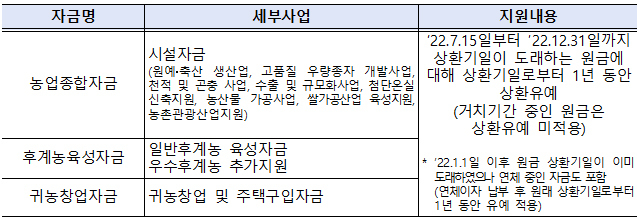 올해 1월 1일 이후 원금 상환기일이 도래해 현재 연체 중이거나, 올해 7월 15일∼12월 31일 상환기일이 도래하는 농업종합자금, 후계농육성자금, 귀농창업자금을 대상으로 한다.