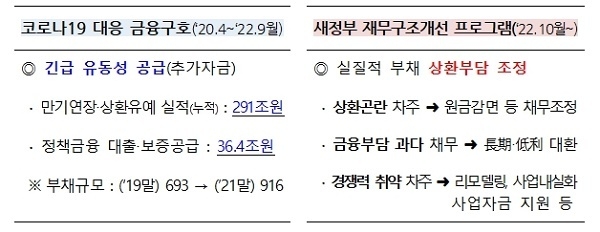 이를 위해 새출발기금을 통해 30조원 규모의 부실 채권을 매입해 채무 조정에 나선다. 거치 기간은 최대 1∼3년으로 장기·분할 상환(최대 10∼20년)에 대출 금리도 인하한다. 연체 90일 이상 부실 차주에 대해서는 최대 90%까지 원금을 감면해준다.