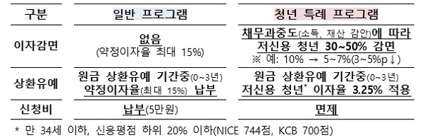 우선 소득과 재산 등 채무과중도에 따라 저신용 청년의 이자를 30~50% 감면한다.