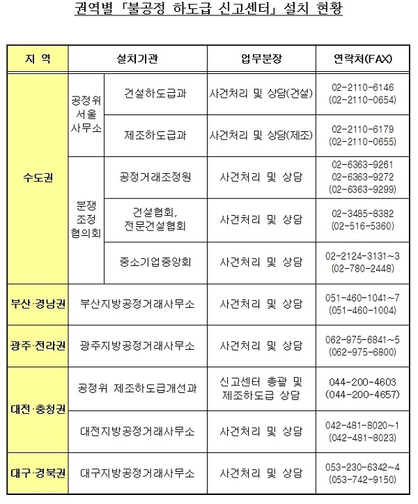 공정위 본부 및 지방사무소는 물론 하도급 분쟁조정 협의회에도 신고센터를 설치해 중소 하도급 업체의 신고 편의성을 높일 예정이다. 신고센터에 접수된 사건은 통상적인 신고 처리 방식과 달리 하도급 대금 조기 지급에 중점을 두고 최대한 신속하게 처리할 계획이다.