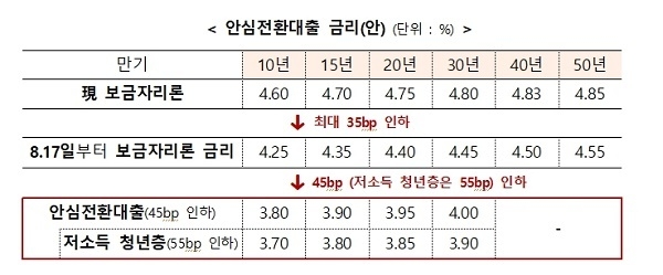 한편 금융위는 안심전환대출 출시 준비와 함께 보금자리론 금리를 현 수준 대비 최대 0.35%포인트 인하하고 연말까지 금리를 동결한다고 밝혔다.