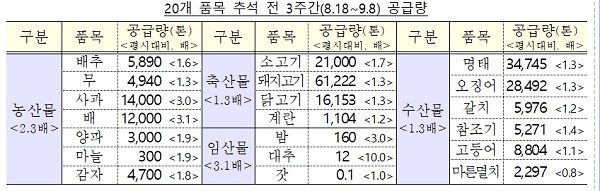 이에따라 20대 성수품 공급량을 역대 최대 수준인 23만톤으로 늘리기로 했다. 이는 평시 대비 1.4배에 달하는 규모다.