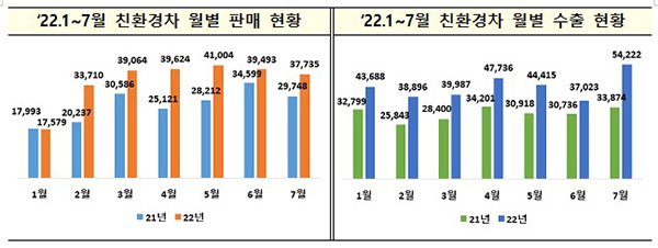 전기차는 다양한 모델로 월 판매실적 상위 3개를 모두 올해 기록해 친환경차 내수판매의 6개월 연속 증가세에 기여했다. 7월 누적 전기차 보급대수도 30만대를 돌파해 친환경차는 전체 자동차 등록대수의 5.6%를 차지했다.