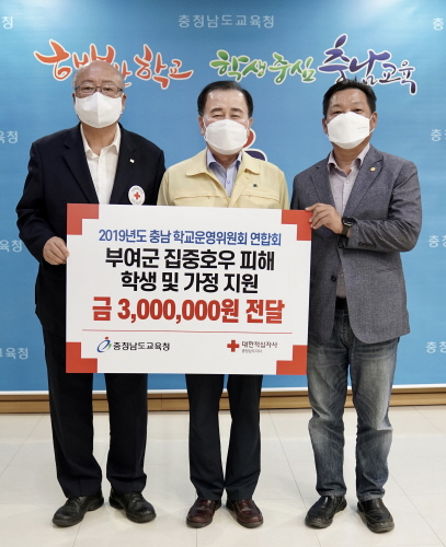 이번 성금은 2019년도 충남 학교운영위원회 연합회로 함께 활동했던 시·군 학교운영위원장 협의회 회장들이 모여 마련한 것으로 부여지역 집중호우로 인해 수해 피해를 입은 학생들을 위로하고 피해 가정을 지원하기 위해 3백만 원을 모금했다.
