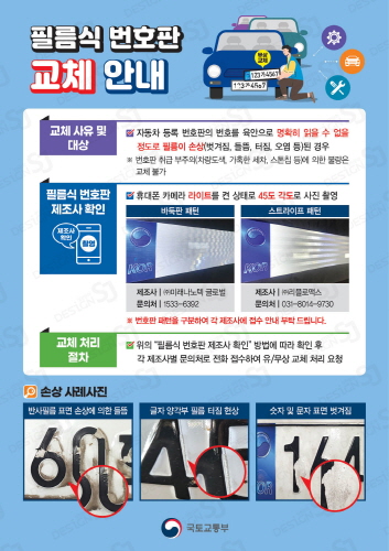 벗겨짐, 들뜸, 터짐, 오염 등 필름식 번호판 번호를 맨눈으로 명확히 읽을 수 없을 정도로 필름이 손상된 경우 무상 교체 대상이며 가까운 번호판 교부소가 아닌 최초 차량 번호판을 수령한 곳으로 방문할 시 무상 교체 받을 수 있다.
