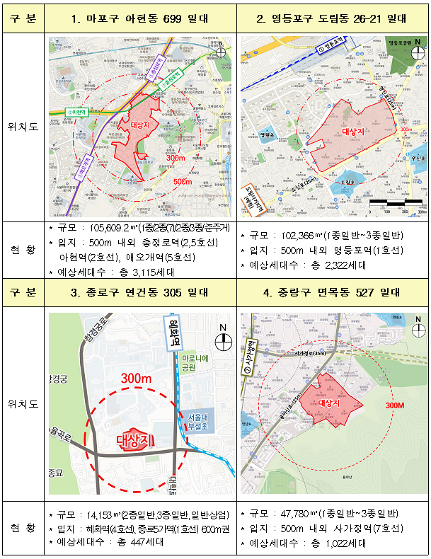 종로구 연건동 305번지 일대(1만 4153㎡·477가구)와 중랑구 면목동 527번지 일대(4만 7780㎡·1022가구), 구로구 구로동 252번지 일대(1만 1428㎡·287가구)에서도 공공재개발이 진행된다.