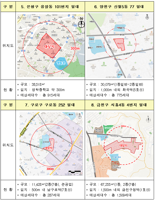 금천구 시흥4동 4번지 일대(6만 7255㎡·1509가구)와 은평구 응암동 101번지 일대(3만 8518㎡·915가구), 양천구 신월5동 77번지 일대(3만 79㎡·775가구)도 재개발이 추진된다.