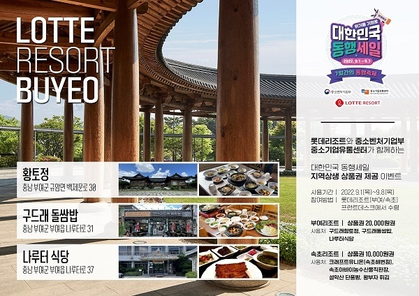 롯데리조트(부여·속초) 투숙객이 백년가게와 전통시장 등을 방문해 상품 구매 시 할인을 받을 수 있도록 바우처(1만~2만 원권)도 지급한다. 투숙객 대상 바우처 지급 행사는 다음 달 1일부터 10일까지 진행한다.