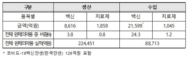 코로나19 백신·치료제의 지난해 총 생산실적은 1조 475억원, 총 수입실적은 2조 2644억원으로 전체 완제의약품 생산실적(22조 4451억원)의 4.7%, 수입실적(8조 8713억원)의 25.5%를 차지했다.