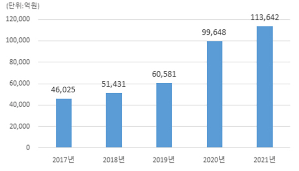 지난해 국내 바이오의약품 시장규모는 7조 111억원으로 2020년(3조 3029억원) 대비 112.3% 증가해 최근 5년 중 가장 높은 증가폭을 보였다. 이는 바이오의약품에 해당하는 코로나19 백신·치료제의 신규 생산·수입실적이 추가된 데 기인한 것으로 분석된다.