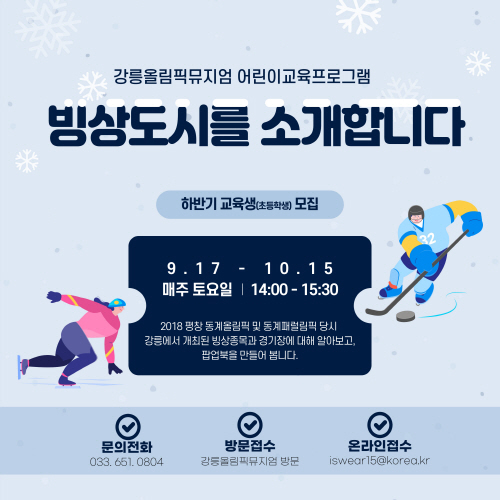 강원 강릉시는 강릉올림픽뮤지엄에서 가족과 함께하는 올해 하반기 어린이프로그램 '빙상도시 강릉을 소개합니다' 교육생을 모집한다고 2일 밝혔다.